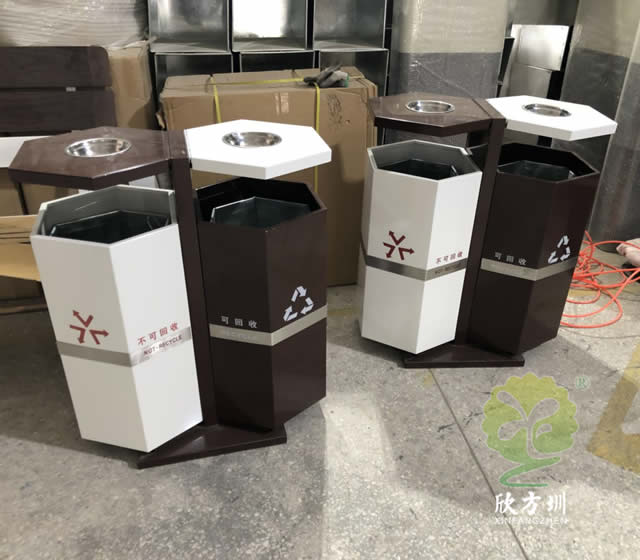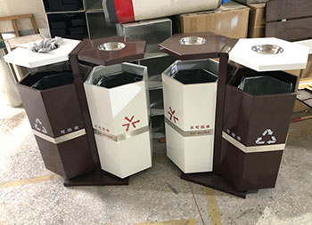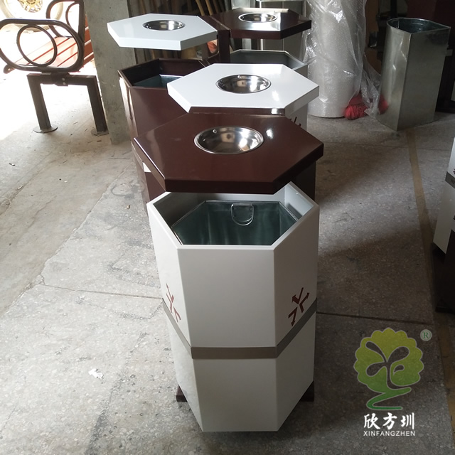 六邊形戶外鋼制分類垃圾桶采用優(yōu)質(zhì)的冷軋鋼板制造而成,這個(gè)垃圾箱六邊形不可回收、可回收兩分類設(shè)計(jì),頂部帶有兩個(gè)煙灰盅方便收集煙灰煙頭,底部帶四個(gè)膨脹螺絲孔可以固定在地面防止挪動(dòng)被盜,可以定制絲印垃圾分類圖標(biāo)以及企業(yè)logo,工藝采用了噴涂噴塑不掉色。