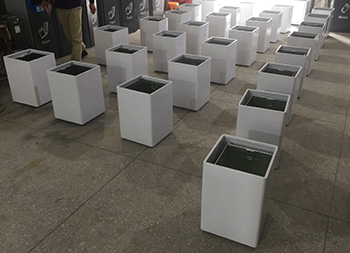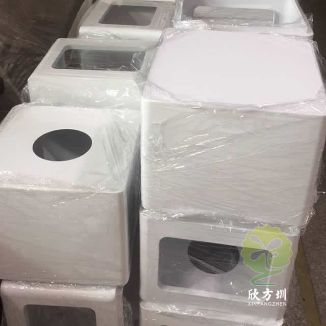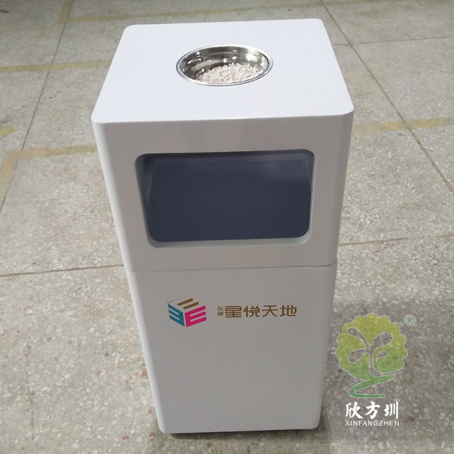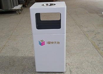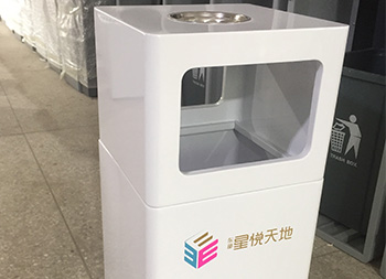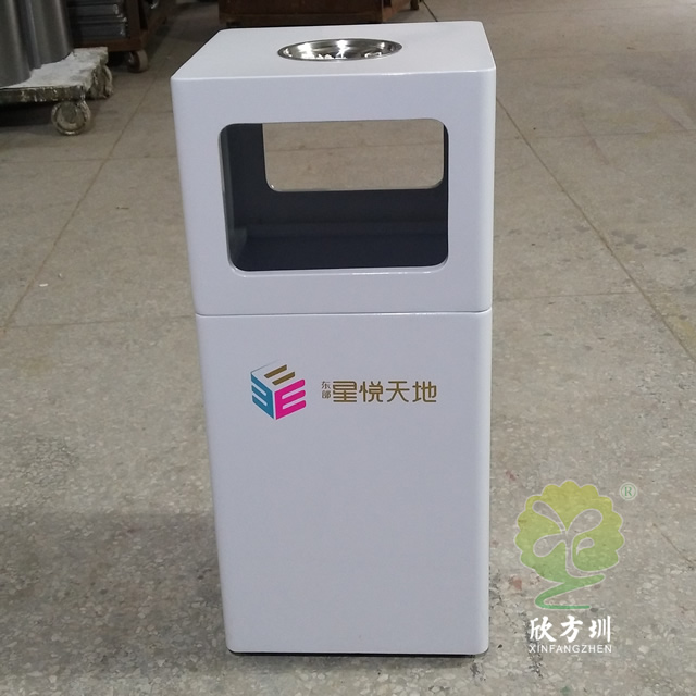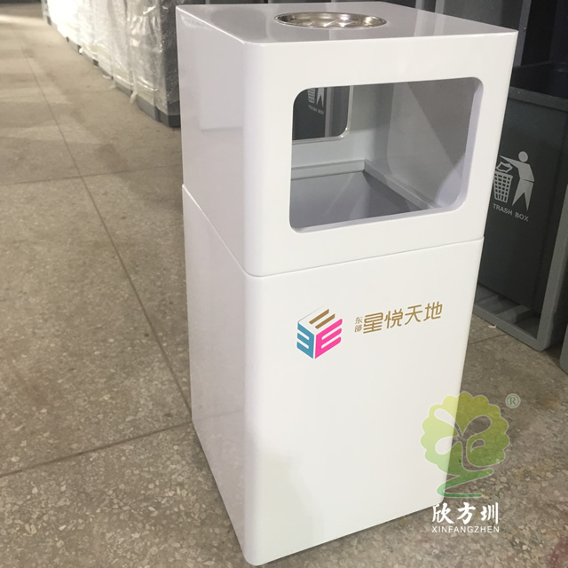 商場室內(nèi)方形金屬鋼制果皮箱采用優(yōu)質(zhì)的冷軋鋼板折彎焊接打磨而成,垃圾桶身整體采用了白色的噴涂噴塑工藝上色,這款垃圾桶是絲印東部新悅天地企業(yè)名稱和彩色的LOGO,頂部中心位置帶一個(gè)煙灰盅方便收集煙灰煙頭,整體設(shè)計(jì)簡潔美觀,支持定制絲印或者使用其他工藝。