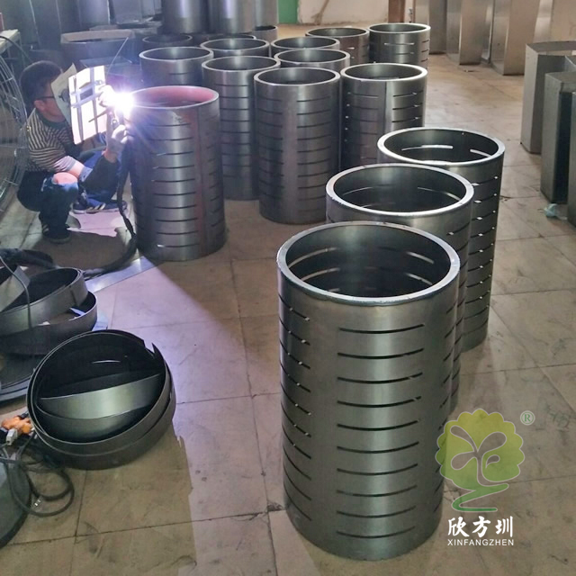 室外廣場圓柱形鋼制垃圾桶采用優(yōu)質(zhì)的冷軋鋼板裁剪焊接制作而成,這款板材加厚黑色垃圾桶使用了鏤空戶外高溫烤漆圓柱形立式直投口設(shè)計,直徑450mm高度800mm,桶身頂部絲印了企業(yè)名稱及l(fā)ogo,可以按照要求定制合適戶外果皮箱。