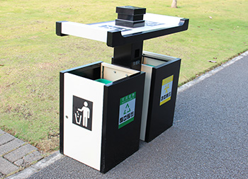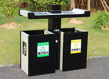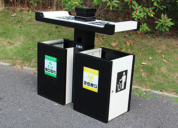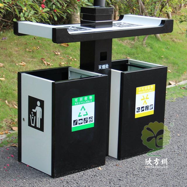 室外噴塑冷軋鋼板分類垃圾箱采用優(yōu)質(zhì)的冷軋鋼板制作而成,復(fù)古方形雙桶可回收物、不可回收物兩分類大投口設(shè)計(jì),黑色、白色組合噴塑工藝,中間帶一根柱子中上部分帶一個(gè)滅煙處投口底部帶一個(gè)廢電池投口,底部有一個(gè)三角鑰匙鎖打開可以取出廢電池和煙頭,桶身左右?guī)氰€匙鎖頭開門可以取出內(nèi)筒。