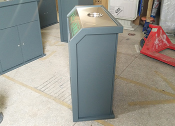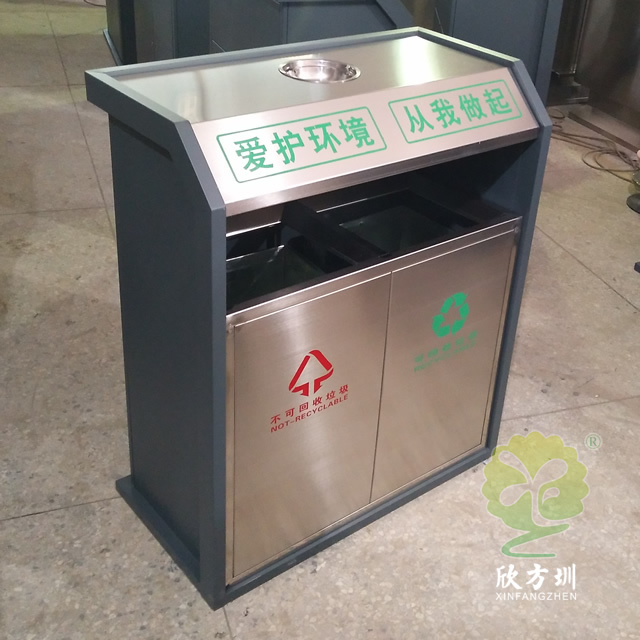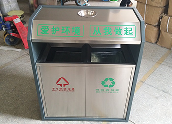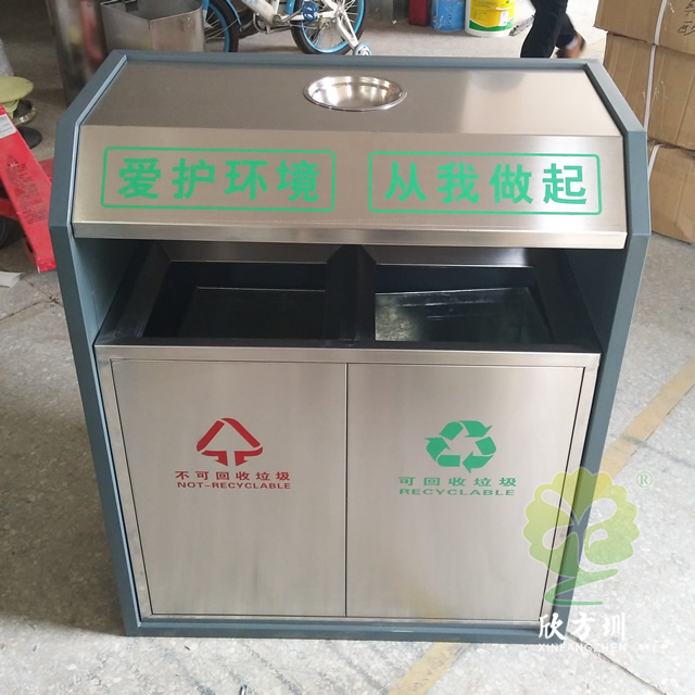 戶外市政道路兩分類鋼板垃圾箱這款垃圾桶采用了優(yōu)質(zhì)的冷軋鋼板裁剪焊接而成,可回收垃圾、不可回收垃圾屋形雙分類設(shè)計,頂部帶煙灰盅方便滅煙收集煙頭,坡面絲印了“愛護環(huán)境、從我做起”,桶身框架灰色噴塑工藝,這款產(chǎn)品我們廠家支持定制三、四、五分類,可以不選擇煙灰盅。