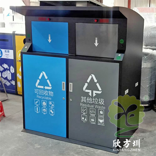 戶外智能感應(yīng)鍍鋅板分類(lèi)垃圾桶采用了優(yōu)質(zhì)的鍍鋅板制造而成,框架?chē)娡繃姺酆谏苫厥瘴镩T(mén)板和投口噴塑了藍(lán)色,其他垃圾門(mén)板和投口噴塑了灰色,左右兩邊帶觸摸感應(yīng)開(kāi)蓋和按鍵開(kāi)蓋,投口上方帶指示燈,可以定制不銹鋼材質(zhì)的,或者三分類(lèi)及四分類(lèi)垃圾箱。