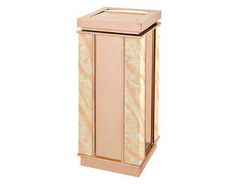 欣方圳鈦金垃圾桶由鍍金鋼板或不銹鋼和大理石制作而成,表面經(jīng)除油、清洗、酸洗、清洗、表調(diào)、磷化、清洗、烘干、靜電粉末噴涂、高溫塑化、冷卻等工藝處理。極耐磨損、耐酸、耐堿,耐腐蝕性,永遠(yuǎn)不會(huì)生銹。產(chǎn)品表面呈金黃色,光滑亮麗,彰顯高貴本色,適用于各種高檔室內(nèi)場(chǎng)合。