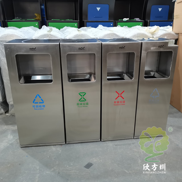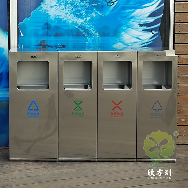 廣場(chǎng)組合式不銹鋼分類垃圾桶可以采用201或者304不銹鋼板制作,產(chǎn)品型號(hào):C819,尺寸規(guī)格:小桶尺寸340*340*985mm、大桶尺寸428*340*985mm,戶外方形本色單面投口抽拉式開門設(shè)計(jì),組合式3個(gè)小桶1個(gè)大桶直接擺放,正面中心位置絲網(wǎng)印刷了四色的最新分類標(biāo)識(shí),分別可回收物為藍(lán)色、廚余垃圾為綠色、有害垃圾為紅色、其他垃圾為黑色,正面頂部絲印黑色的企業(yè)logo,其他垃圾桶用手機(jī)帶一個(gè)滅煙盒,內(nèi)筒采用常規(guī)的鍍鋅板內(nèi)桶,這款垃圾桶時(shí)候擺放在廣場(chǎng)、公園、小區(qū)、工業(yè)區(qū)、地鐵口等場(chǎng)景,可以根據(jù)場(chǎng)景的大小定制組合式分類垃圾桶。