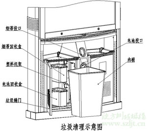 將電池及煙蒂回收盒從塑料托架上抽出,清理垃圾后放回原位;將內(nèi)桶放回原位,關(guān)上門子,再轉(zhuǎn)動鑰匙將門子鎖。话纬鲨匙。