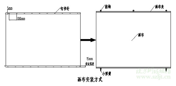 3.2非滾動畫布安裝:先將畫布上邊和下邊折15mm左右,用釘書針裝釘(如下圖所示),然后將畫布水平插入畫布夾,夾住畫布,打開窗蓋,在廣告箱頂部和底部設(shè)有五個孔(頂部3個,底部2個),將畫布頂部掛鉤圓孔與廣告箱頂部圓孔對齊,然后將M5*12螺栓插入,背面擰上M5螺母固定,再將小彈簧掛在底部掛鉤圓孔上,然后將小彈簧底部掛在廣告箱底部圓孔中。關(guān)閉窗蓋,用同樣方法安裝另一面畫紙。