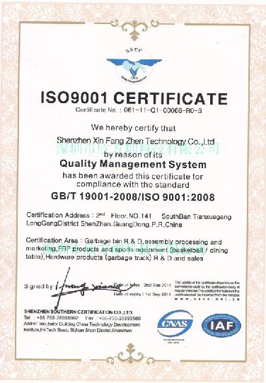 于2011年9月2日獲得中國質(zhì)量認證中心頒發(fā)的ISO9001質(zhì)量認證證書和ISO14001環(huán)境認證證書,通過認證范圍:垃圾桶的研發(fā)、組裝加工和銷售,玻璃鋼制品及體育器材(籃球架/餐臺)、五金制品(垃圾車)的研發(fā)和銷售