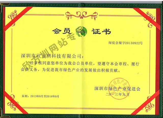 2013年9月,經(jīng)過深圳市綠色產(chǎn)業(yè)促進(jìn)會(huì)的審核批準(zhǔn),欣方圳科技榮獲“深圳市綠色產(chǎn)業(yè)促進(jìn)會(huì)會(huì)員單位”殊榮。