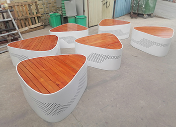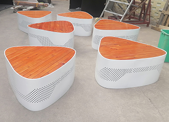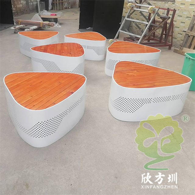 戶外三角形不銹鋼防腐木園林椅可以采用201或者304不銹鋼板制造,木條可以采用防腐松木或者竹木制作,不銹鋼板支撐架采用了2.0毫米的厚的板材,金屬做了創(chuàng)意的鏤空表面做噴塑烤漆處理工藝,支持定制各種形狀金屬加木條或者玻璃鋼加木條的戶外座椅,提成城市公共區(qū)域美觀度。
